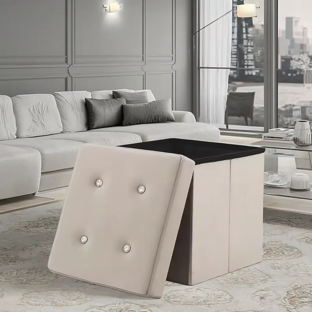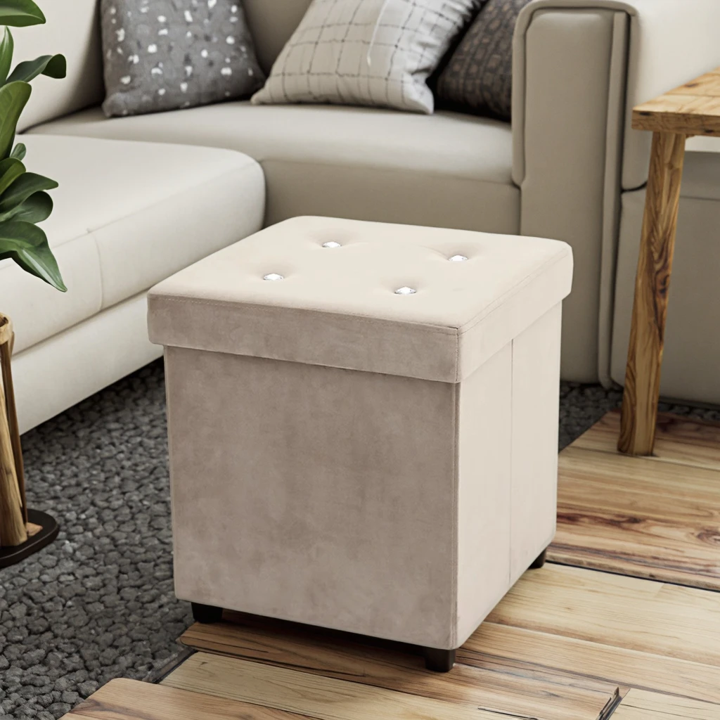 The Wholesale Foldable Velvet Storage Stool Portable and Adjustable with Diamond Trim Cover for Bedroom Fashionable Square Design features a sophisticated square silhouette that complements modern interior design themes. The velvet fabric covering provides a premium tactile experience while the diamond trim detailing adds an element of luxury that distinguishes this piece from standard storage solutions. The square design maximizes storage capacity while maintaining a compact footprint suitable for various room configurations.