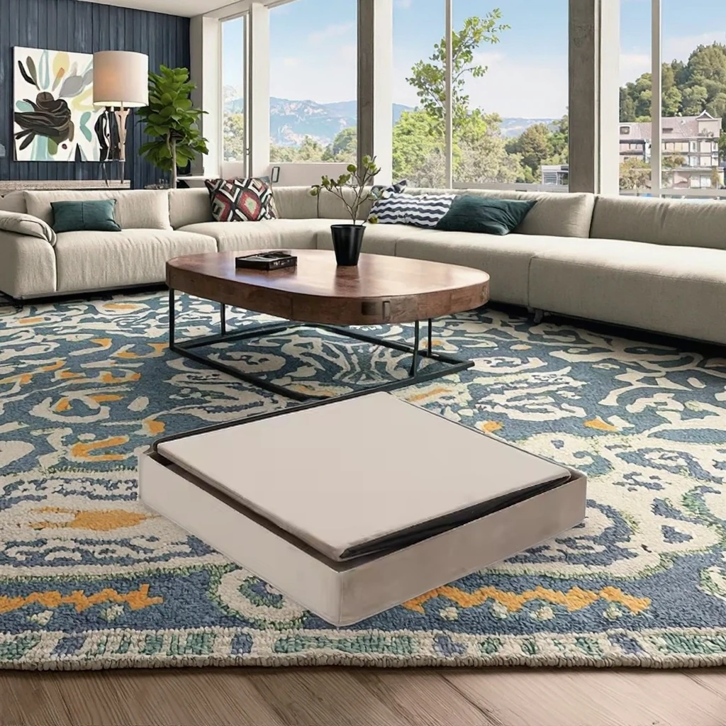 Internal storage compartments provide organized space for bedroom essentials, seasonal items, linens, or personal belongings. The square configuration maximizes storage efficiency while maintaining exterior dimensions appropriate for bedroom placement. Hidden storage capabilities help maintain clean, uncluttered living spaces that align with minimalist design trends.